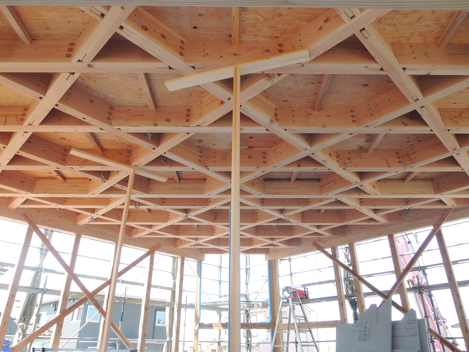 短い部材でも遠くへスパンを広げる大きな空間を作り上げることが特徴です。